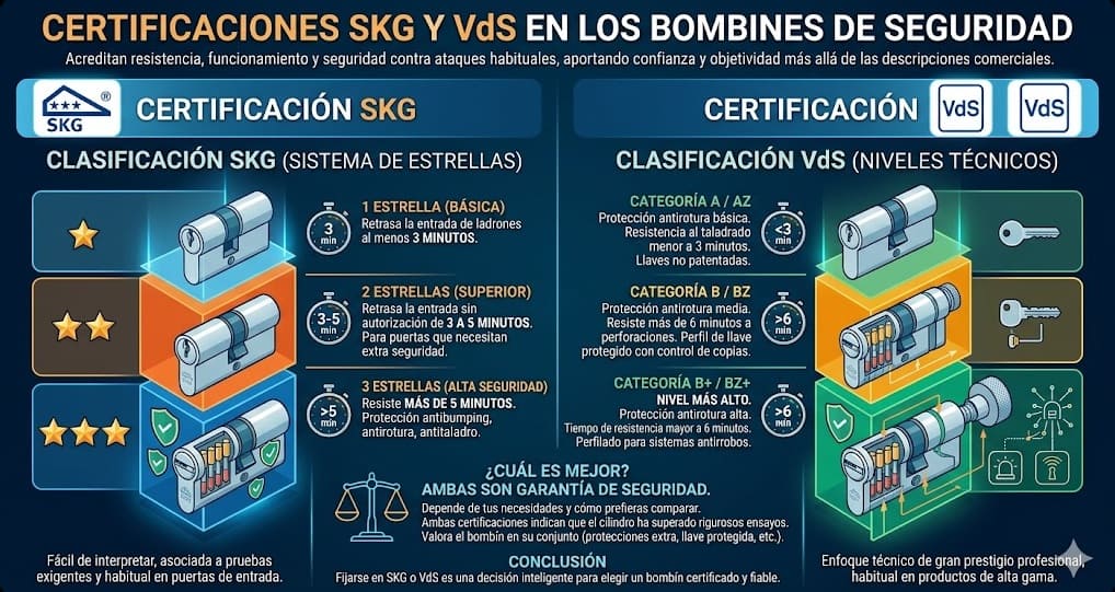Cuando se busca un bombín de seguridad para una vivienda, un negocio o una comunidad, no solo importa la marca o el tipo de llave. También es fundamental fijarse en las certificaciones que respaldan la calidad y la resistencia del cilindro frente a ataques habituales. Entre las más conocidas dentro del sector de la cerrajería destacan la certificación SKG y la certificación VdS, dos referencias muy valoradas en Europa a la hora de elegir un cilindro de cerradura fiable.