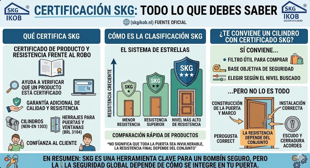 Dicho de forma sencilla para un usuario que quiere cambiar un bombín de cerradura, la clasificación SKG sirve como una referencia rápida para comparar productos. Un cilindro con más estrellas no significa automáticamente que toda la puerta sea invulnerable, pero sí que el componente certificado ha sido clasificado en un nivel superior dentro del sistema SKG.
