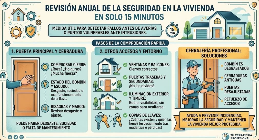 Nosotros, como cerrajería profesional, solventamos el problema cuando esa revisión de 15 minutos revela que algún elemento necesita mantenimiento, sustitución o mejora. Hacer esta comprobación una vez al año es una forma sencilla de cuidar la vivienda, prevenir imprevistos y mantener los accesos en condiciones más seguras.
