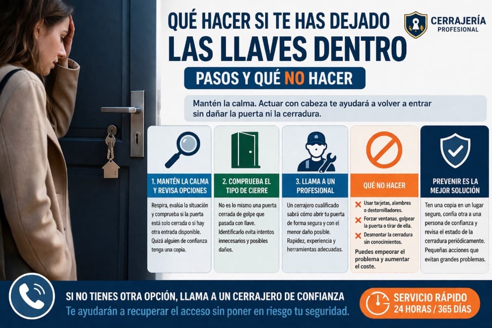 Cuando las llaves se quedan dentro, conviene seguir un orden lógico para recuperar el acceso sin poner en riesgo la puerta, el bombín ni tu seguridad. Saber cómo reaccionar y qué errores evitar puede marcar la diferencia entre una solución rápida y una incidencia mayor.